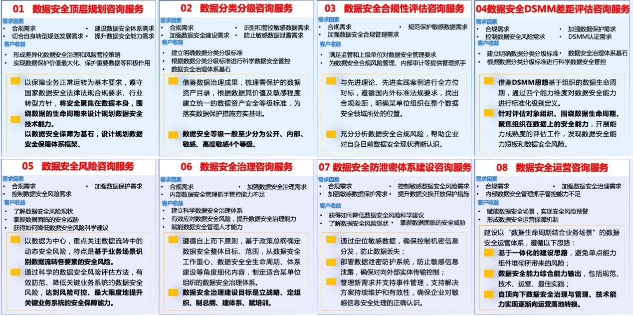 数据安全咨询服务体系自发布以来旨在深度参与客户数据安全体系规划、建设落地到运营的全过程,持续提升数据安全能力成熟度水平,其完整的主线可以概括成“设目标、定框架、数分类、数分级、看现状、识风险、立制度、设策略、制架构、落能力、融流程、验效果”,可提供的核心服务包括八大类:数据安全顶层规划、分类分级、合规评估、DSMM差距评估、风险评估、治理咨询、防泄密体系、运营体系设计咨询服务。