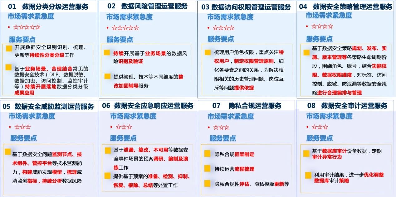 数据安全运营服务经客户实际需求收益、行业技术发展趋势研究发现为重要且紧急的需求,故数据安全服务团队联动“数盾”全系列产品团队协同研究开发,基于不同运营场景,推出八个细项服务:数据安全分类分级运营、风险管理、访问权限管理、策略管理、威胁监测、应急响应、隐私合规、及审计运营服务,不断夯实数据安全八大核心服务基座,逐步形成安恒信息数据安全服务全景图。