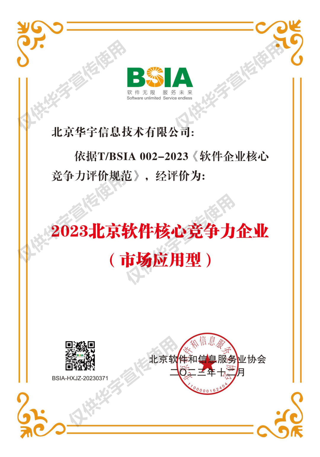 2023北京软件核心竞争力企业评价主要依据最新《软件企业核心竞争力评价规范》(T/BSIA002-2023)团体标准,以软件企业的综合素质为基本要求,针对产业带动力、技术创新力、市场影响力、业务前瞻性等核心要素,从软件企业的企业规模、经营业绩、研发能力、创新成果、质量保证等方面进行评价。此次入选,也表明了华宇在软件市场应用中具有优秀的发展潜力和不俗的竞争力。