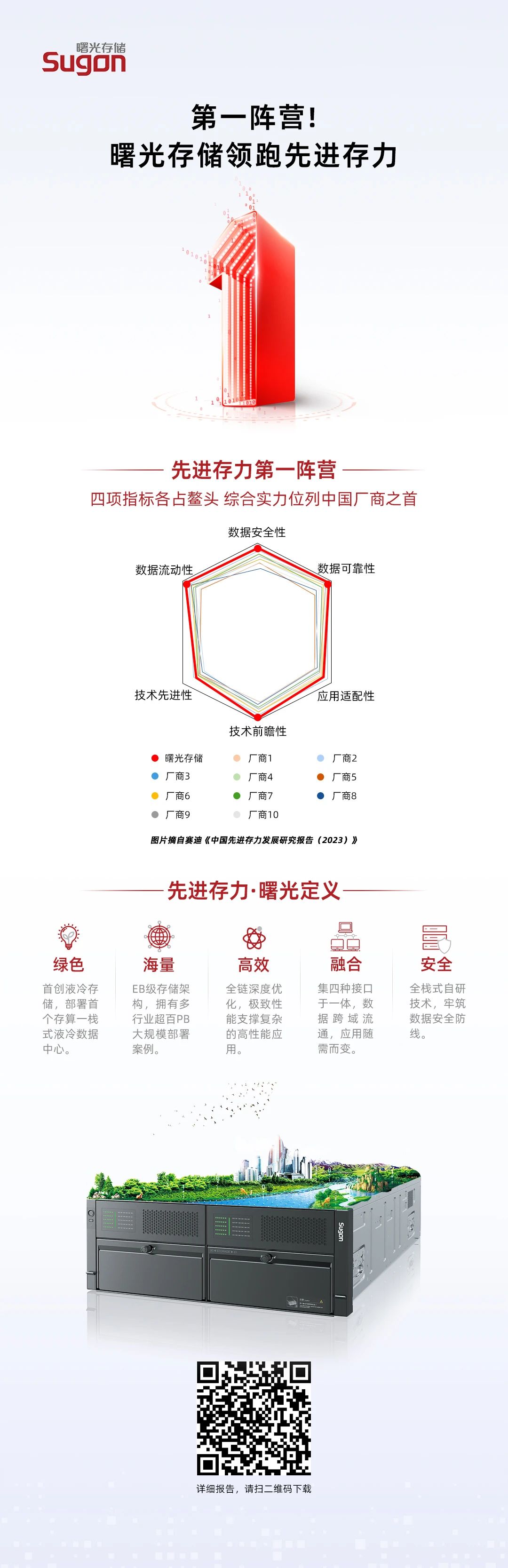 作为首个提出先进存力概念,并率先展开布局的存储厂商,曙光存储正在赋予先进存力更丰富的价值内涵。根据赛迪最新发布的《中国先进存力发展研究报告》(以下简称“报告”),基于存储技术、生态及方案部署等方面实践成果,曙光存储多项评估指标领先业内,已位列国内先进存力第一阵营。