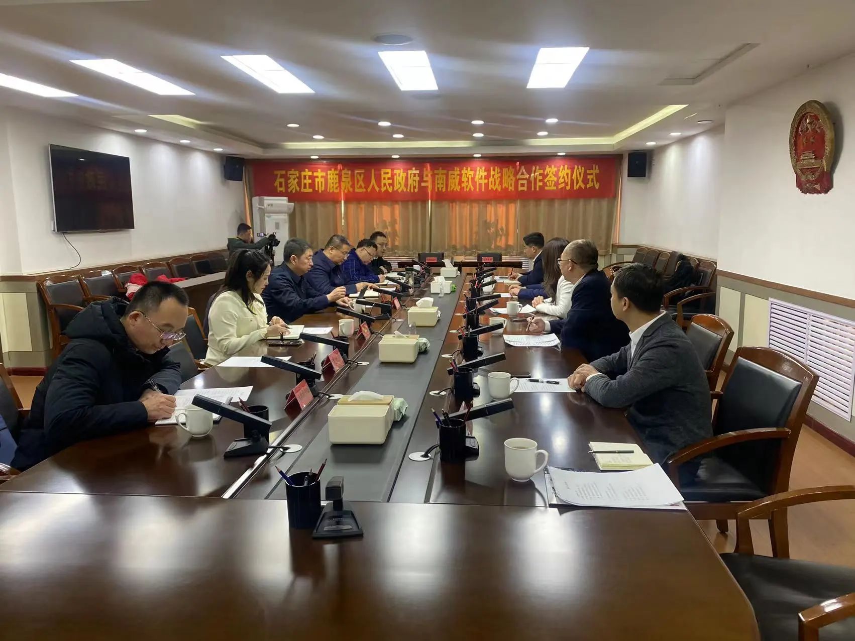 12月26日,石家庄市鹿泉区人民政府与南威软件集团举行战略合作签约仪式。石家庄市投资促进局局长赵勇,鹿泉区委副书记、区长李争以及鹿泉区各委办局领导;南威软件集团董事、总裁徐春梅,集团副总裁李靖、河北销售事业部总经理陈叶鹏、总部大区(三)售前中心总经理张明等共同出席本次签约仪式。