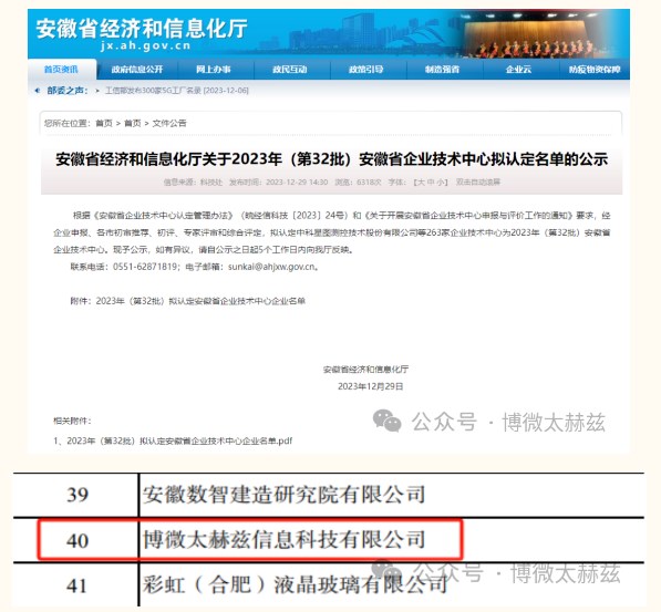 近日,安徽省经济和信息化厅公布了2023年(第32批)安徽省企业技术中心拟认定名单,博微太赫兹公司位列榜单。