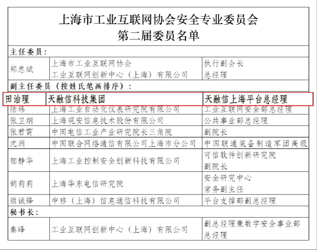 近日,上海市工业互联网协会安全专业委员会(以下简称“安全专委会”)成功召开第二届第一次全体委员会议,完成新一届换届工作。天融信科技集团成功当选安全专委会副主任委员单位,天融信科技集团上海平台总经理田治理任选安全专委会副主任委员。上海市工业互联网协会会长张锡平、上海市经济和信息化委员会软件和信息服务业处处长裘薇出席会议。