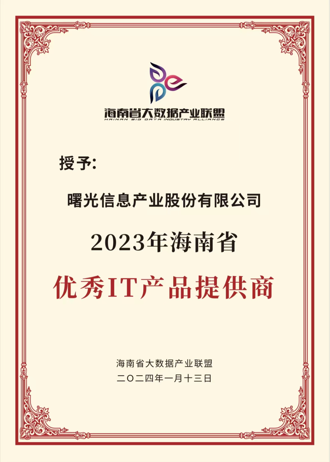 论坛现场还举行了授牌及颁奖仪式,中科曙光凭借过硬的产品与优异的服务,荣获海南省大数据产业联盟授予的“2023年海南省优秀IT产品提供商”。