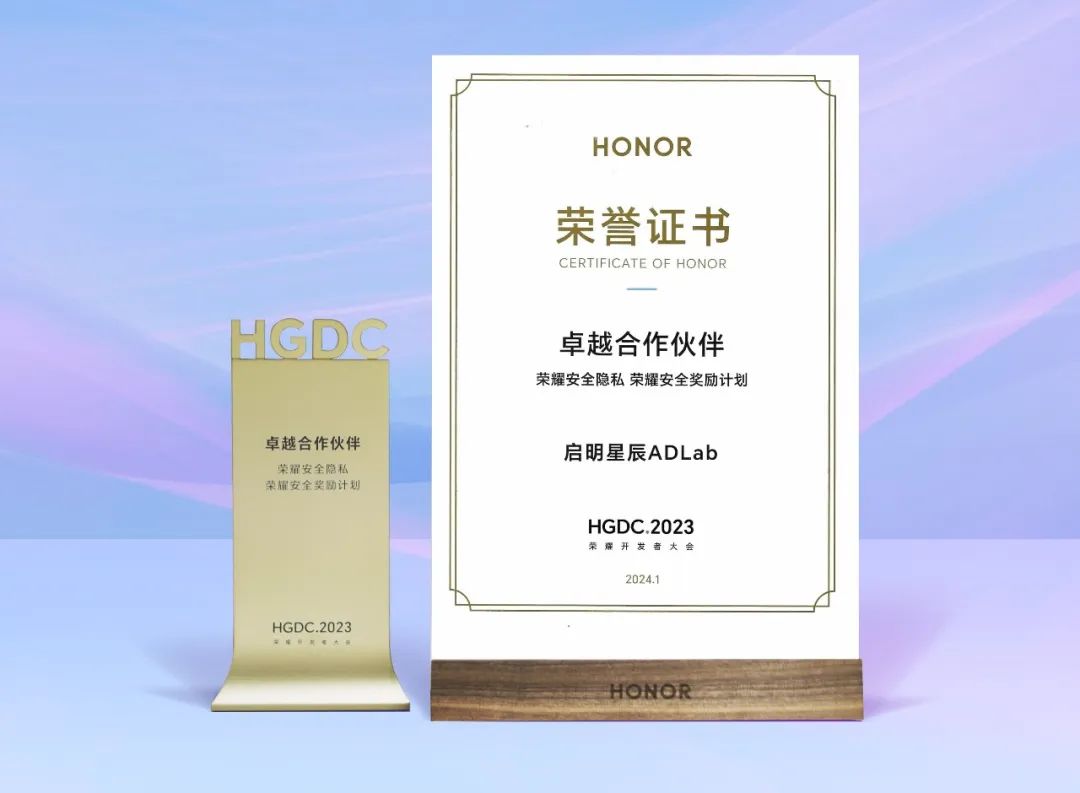 近日,荣耀MagicOS 8.0发布会及开发者大会在上海盛大举行。在荣耀安全与隐私论坛上,荣耀公司正式公布了2023年度荣耀安全奖励计划获奖名单,启明星辰积极防御实验室(ADLab)凭借在荣耀终端安全研究领域的突出贡献,获评“荣耀安全隐私 荣耀安全奖励计划‘卓越合作伙伴’”。