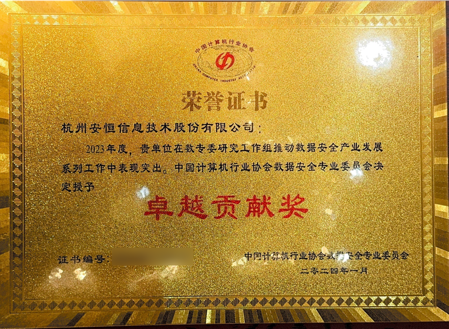 近日,中国计算机行业协会数据安全专业委员会(以下简称“数专委”)汇聚数据安全领域内的顶尖专家及骨干企业召开系列工作组年度工作会议。会上,数专委总结了2023年度工作,展示本年度所取得的成绩以及2024年度工作计划,并表彰了优秀支撑单位,聚集行业企业、共建产业发展“朋友圈”。安恒信息作为数专委成员单位受邀出席并获颁“卓越贡献奖”。