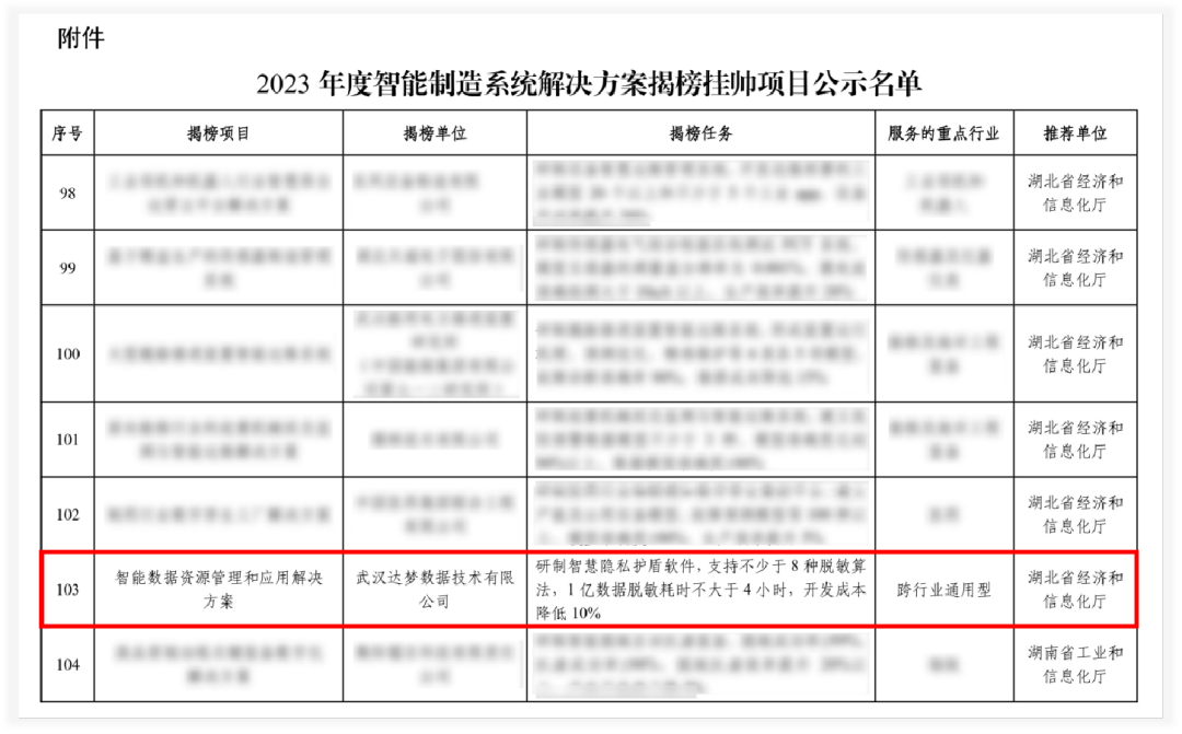 近日,达梦数据全资子公司达梦技术公司“智能数据资源管理和应用解决方案”成功入选国家工信部公示的“2023年度智能制造系统解决方案揭榜挂帅项目名单”。