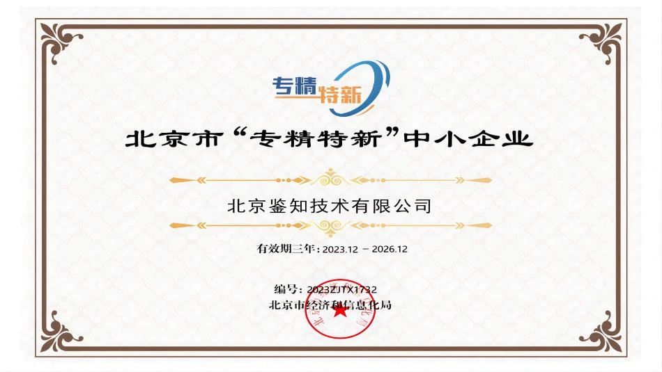 近日,北京市经济和信息化局公布了2023年度第三季度北京市“专精特新”中小企业名单,北京鉴知技术有限公司凭借突出表现和过硬实力顺利通过北京市“专精特新”中小企业审核认定。