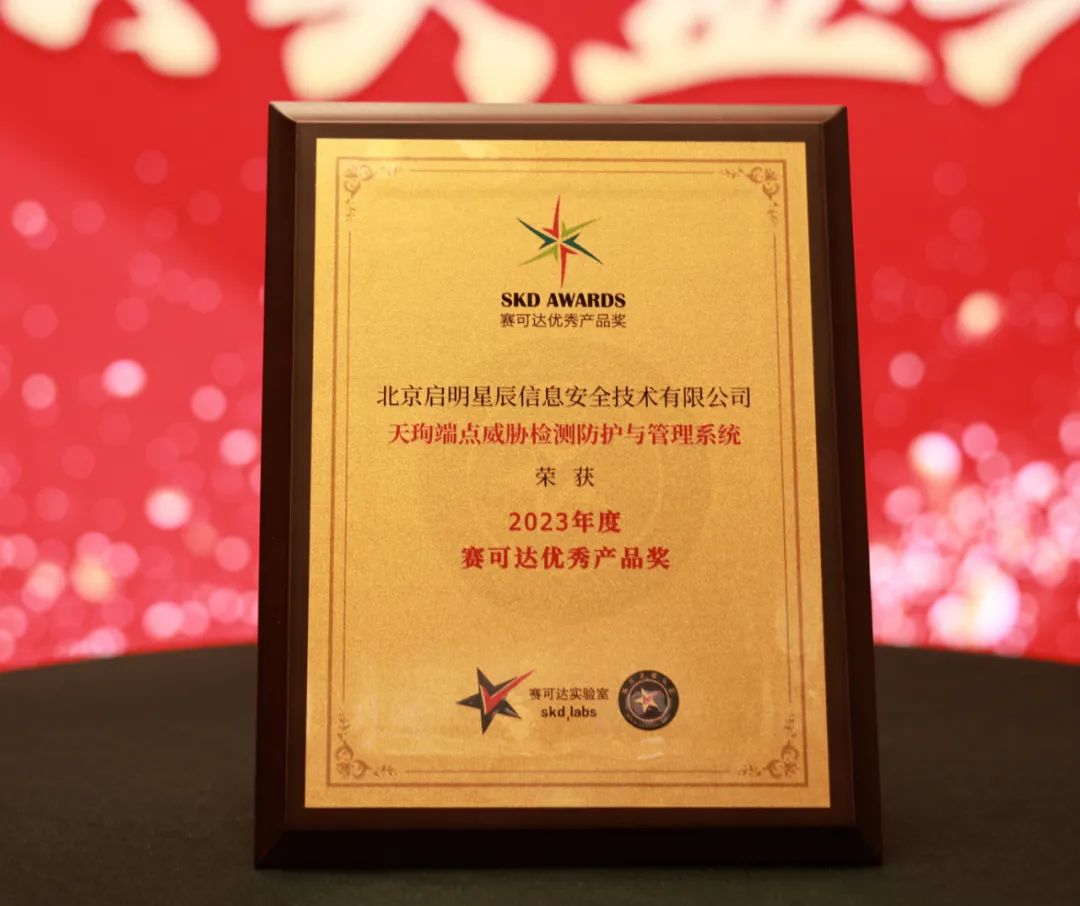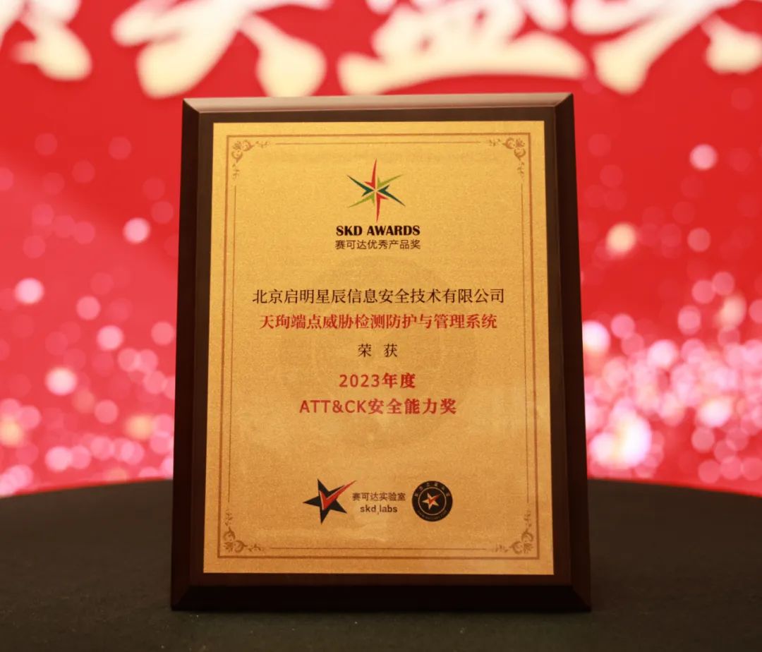 近日,2023年度赛可达优秀产品奖(SKD AWARDS)颁奖盛典在京举行,启明星辰天珣端点威胁检测防护与管理系统(以下简称“天珣EDR”)凭借强劲实力和优异表现力揽2023年度赛可达“优秀产品奖”和“ATT&CK安全能力奖”。