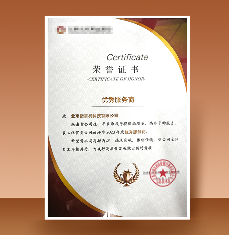 值此辞旧迎新之际,指掌易收获一份特别荣誉——由某农商行颁发的《优秀服务商》荣誉证书。这一殊荣不仅是对指掌易团队过去一年辛勤付出的肯定,更是对指掌易服务品质和技术先进性的极高认可。