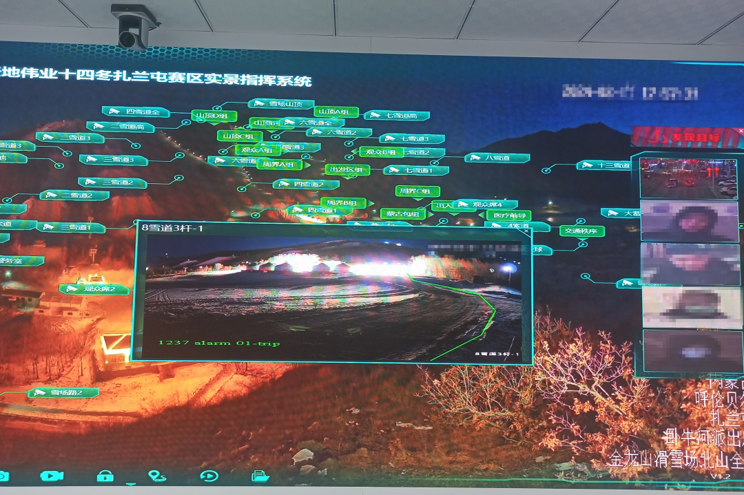 来到“十四冬”指挥调度中心,一块大屏幕上详细展现着车流量记录、运动员抵离情况、各点位实时画面等信息。这块大屏幕是由天地伟业承建的“十四冬”实景指挥调度系统,集协同指挥、安全监控、赛事管理等服务一体化,通过场地上安装的700多个前端点位可以实时监控到赛区各个角落的画面,更好地保障赛事的运行调度。