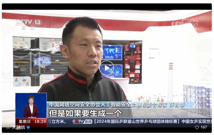 中国网络空间安全协会人工智能安全治理专委会专家、天融信科技集团副总裁薛智慧接受央视新闻采访表示,人工智能技术应用需要多层面监管规范,从源头、技术与法律制度等层面出发加强安全评估和管理。