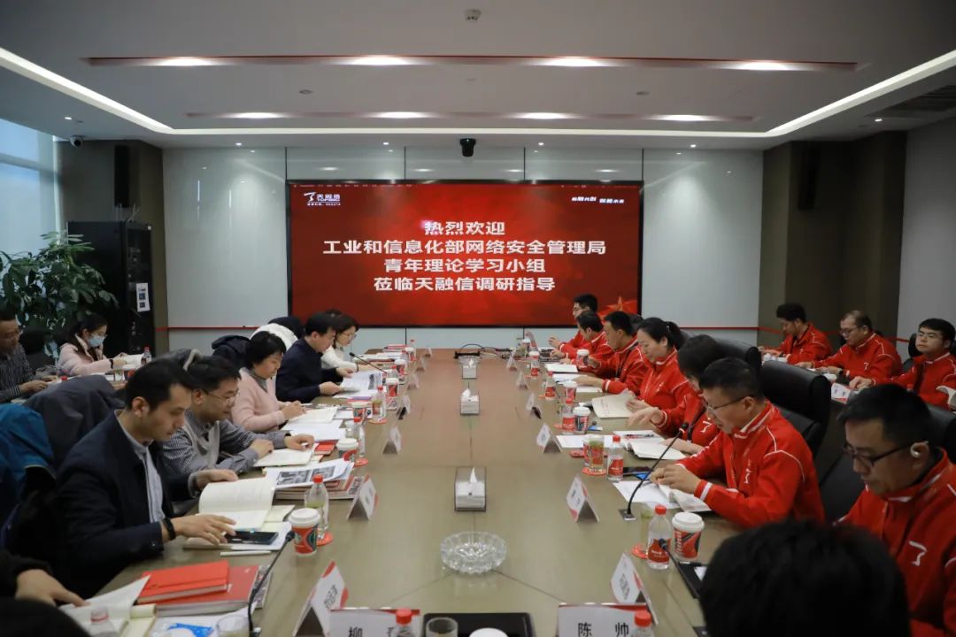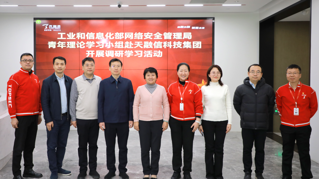 3月6日,工业和信息化部网络安全管理局局长隋静,副局长杜广达,网络安全处处长袁春阳,数据安全处处长雷楠等青年理论学习小组成员走进天融信开展调研学习活动。天融信科技集团党委书记、董事长兼CEO李雪莹,党委副书记、副总裁刘蕾杰,副总裁唐宁等陪同调研并参加学习活动。