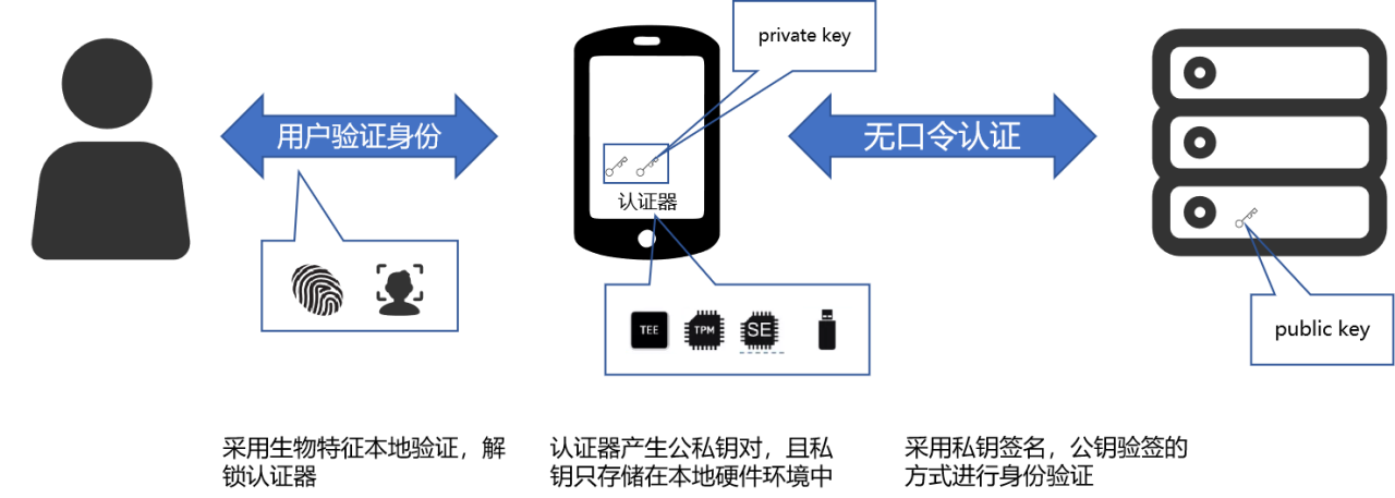 具体而言,目前典型的无口令认证技术是联合使用“用户所有”和“用户所是”技术的双因素认证技术,将用户登录应用服务的认证过程分离为两个步骤,首先是客户端设备本地对用户真实身份的验证,使用的是本地生物特征识别技术,通过本地设备的指纹或人脸等认证方式,确保用户身份真实性,并获得本地私钥的合法使用授权来完成数字签名,属于“所是”类技术的应用;然后是服务端对客户端身份的验证,依托于公钥密码体制的数字签名验签技术,客户端必须使用所拥有的唯一私钥才能完成数字签名操作,属于“所有”类技术的应用。