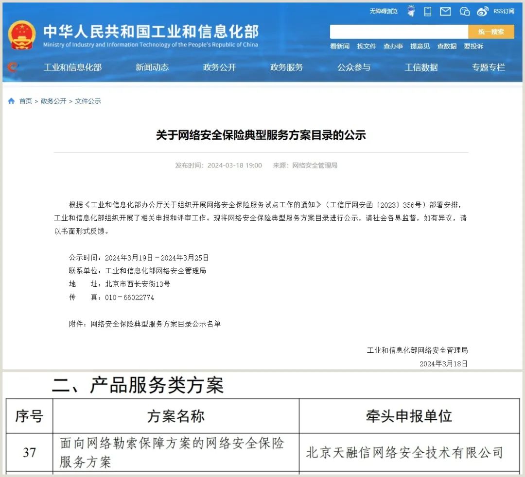 此外,天融信充分发挥自身专业技术优势,支撑多家头部网络安全保险机构完善解决方案,以联合体形式参与的6项申报方案亦入选本次网络安全保险典型服务方案目录。