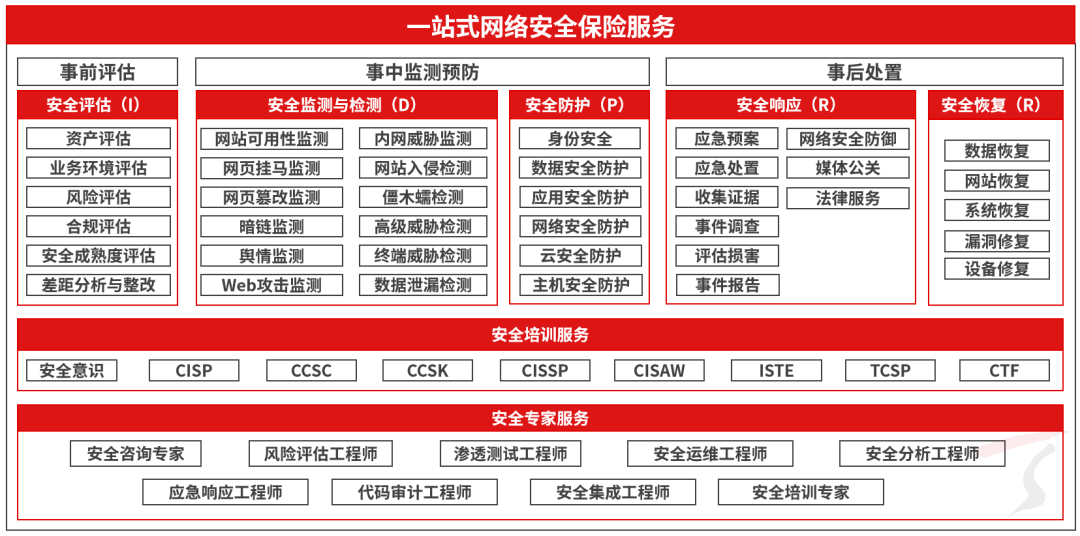 数字化时代,数据安全和业务连续性是企业生存和发展的基石。针对企业核心的数据与业务安全需求,天融信构建了一站式网络安全保险服务体系,为企业提供从事前风险评估、事中监测预防到事后风险处置的全方位服务。