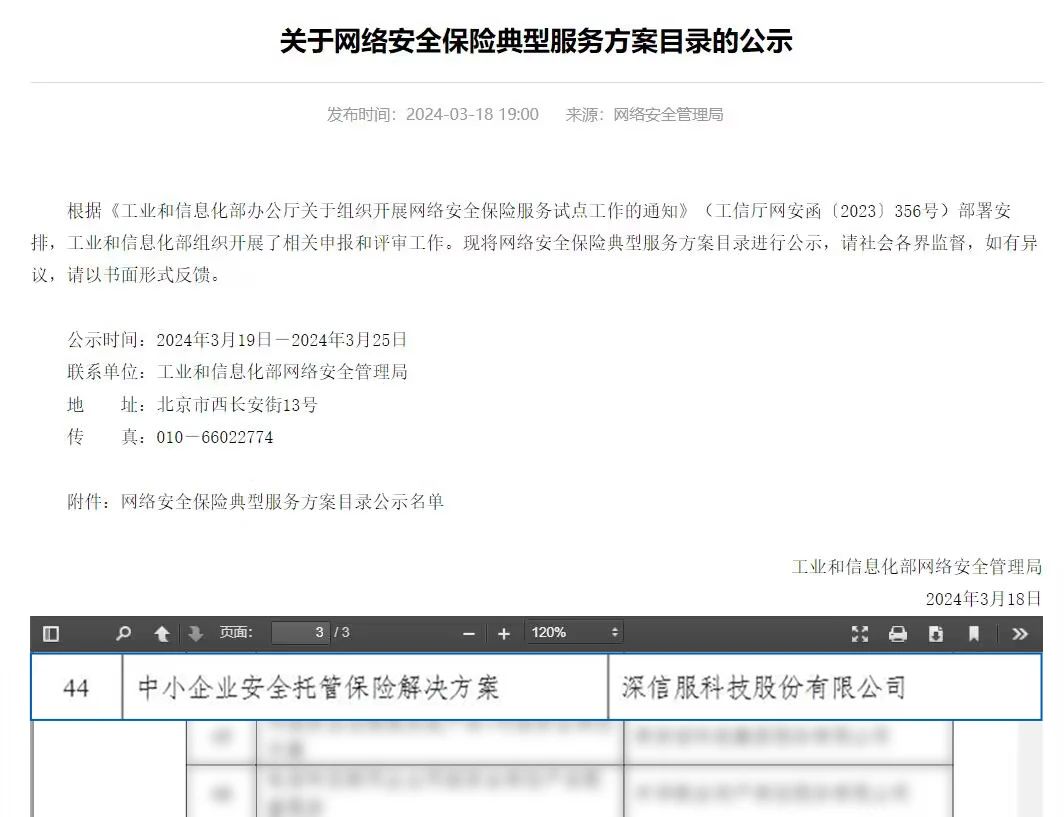 3月18日,工业和信息化部(以下简称“工信部”)网络安全管理局发布《关于网络安全保险典型服务方案目录的公示》,其中,深信服「安全托管服务MSS+保险解决方案」入围产品服务类方案,同时深信服作为支持单位,携手多个头部保险公司共同申报的方案也入围了目录。