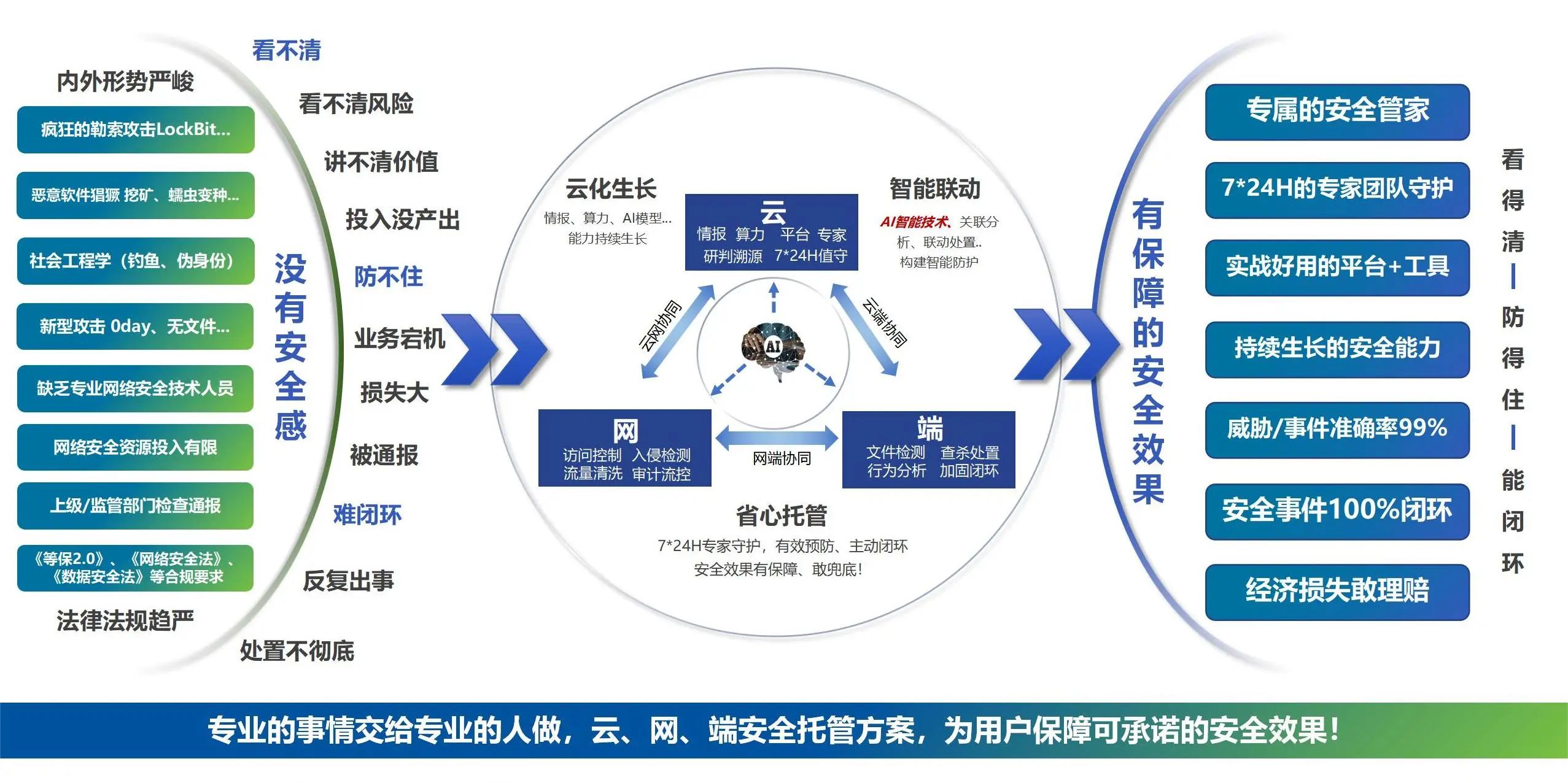 ②服务能力持续生长:安全GPT赋能安全托管服务MSS,有效提升威胁事件检测精准度,提升分析研判和响应处置效率。出现安全事件能及时处置,精准溯源,定向加固,真正能闭环。