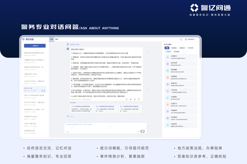 “警亿问通”作为一款基于大模型的公安领域AI应用,通过先进的人工智能技术,为警务工作带来了显著的提升。该应用通过深度学习和整合海量警务知识,为公安执法提供了准确的参考框架,确保执法活动的规范性和合法性。同时,它还通过智能问答交互,为民警提供迅速的法律知识和规范指导,提高执法公正性和权威性。