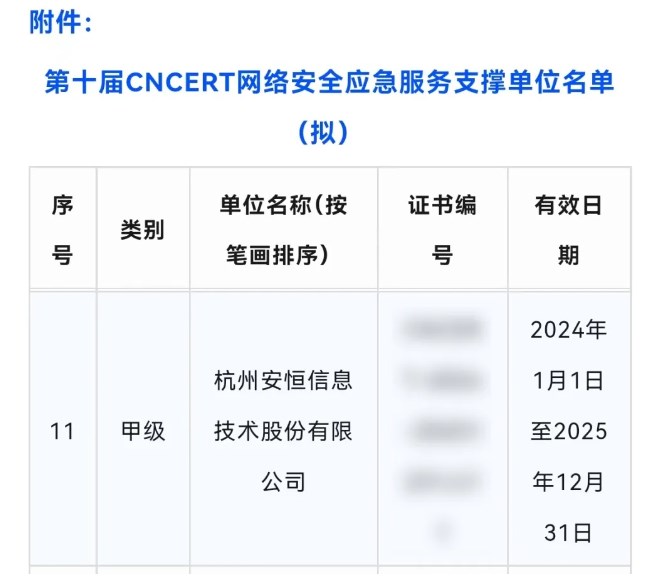 此前,安恒信息也成功入选国家互联网应急中心CNCERT公布的第十届CNCERT网络安全应急服务支撑单位甲级名单,实现了连续五届获得CNCERT网络安全应急服务支撑单位证书。