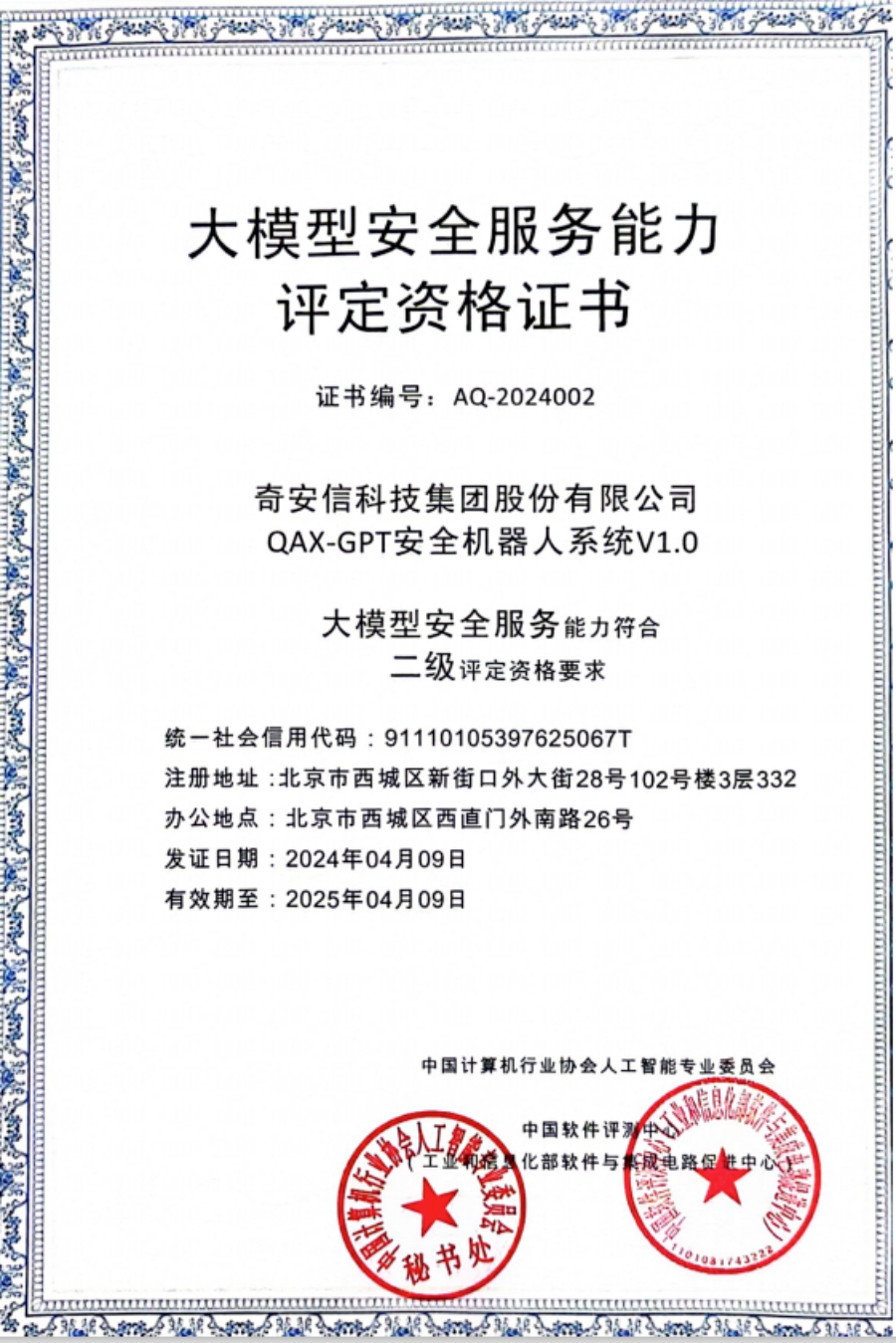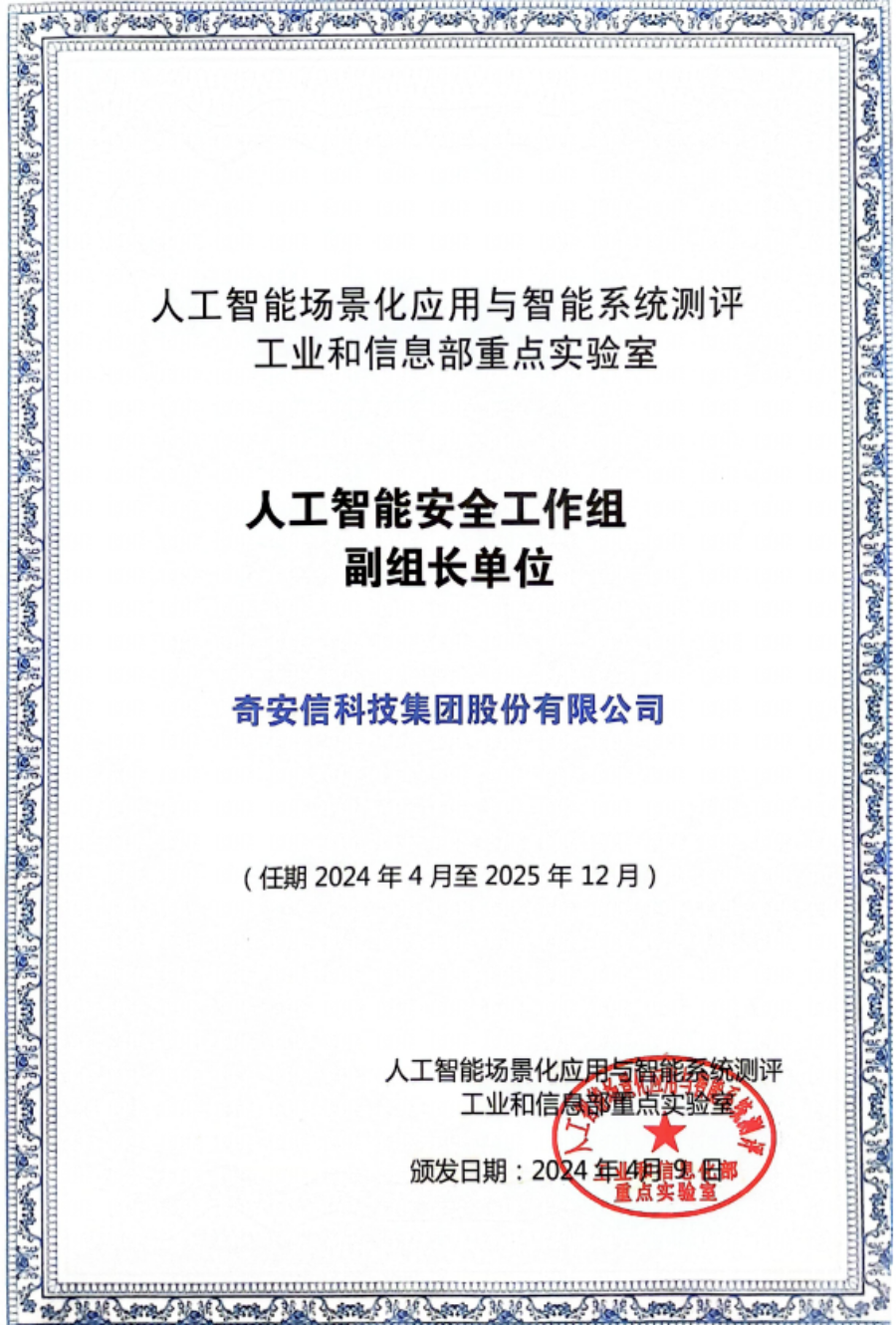 4月9日,奇安信QAX-GPT安全机器人凭借多个方面的综合优异表现,获评国内首批“大模型安全评定证书”,被认定符合二级评定资格要求,这也是迄今为止大模型安全服务能力的最高级别认证,处于业界领先水平。与此同时,AI安全工作组正式成立,奇安信集团作为唯一网络安全企业获聘为AI安全工作组副组长单位。
