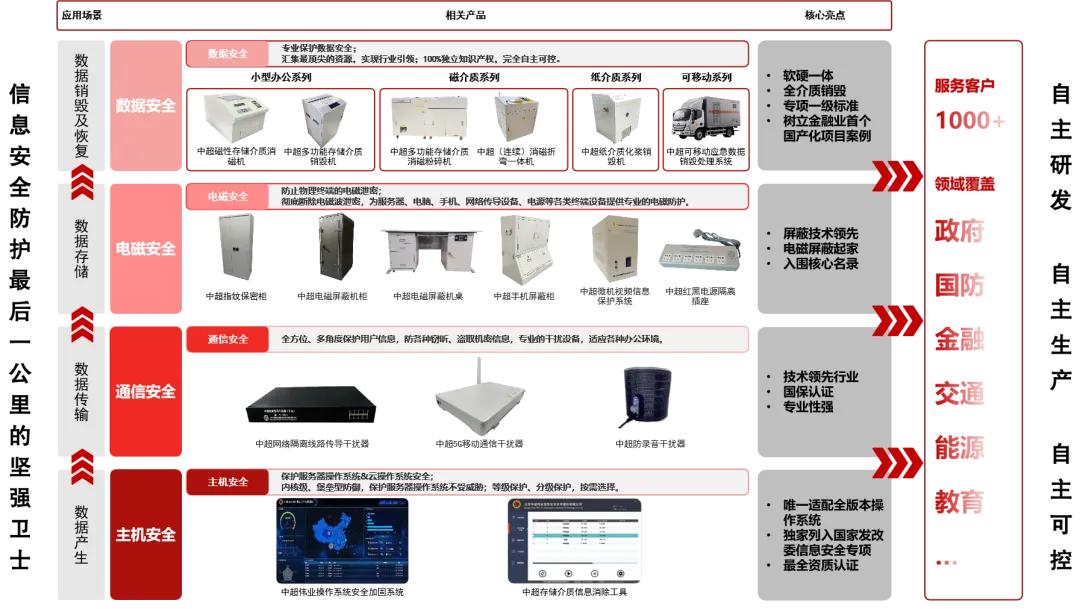 近年来,中超伟业在信息安全领域不断深入研发,在数据源的安全、数据标识及识别的安全、数据传输与交换的安全、数据及数据介质的空间安全、数据及数据介质的物理安全方面取得诸多技术突破及成果转化,自研产品已广泛应用于保密会议室、屏蔽室、销毁中心、智能仓储等工程项目,建设能力专业领先。