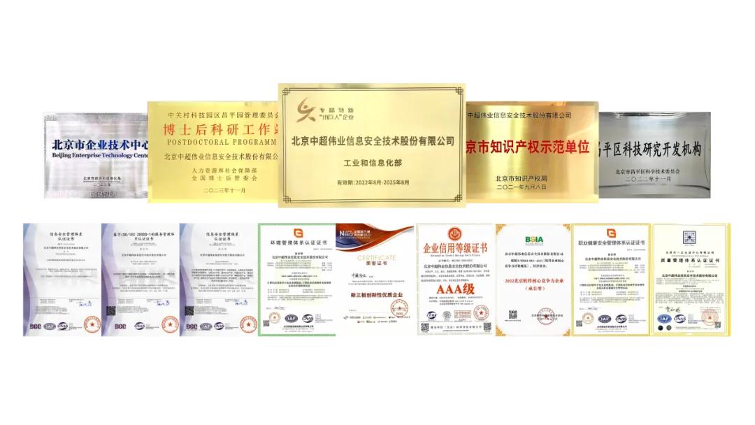 中超伟业于2009年在北京中关村科技园区成立,2019年在新三板成功挂牌,是国家级专精特新“小巨人”企业、国家高新技术企业。专注于信息安全产品的研发、生产、销售,具备完善的业务资质体系,为客户提供卓越的信息安全解决方案,形成了国内领先的主机安全、数据安全、电磁安全、通信安全四大业务品类,已成为政府、金融、能源、交通、教育和互联网等领域的信息安全产品主选品牌。