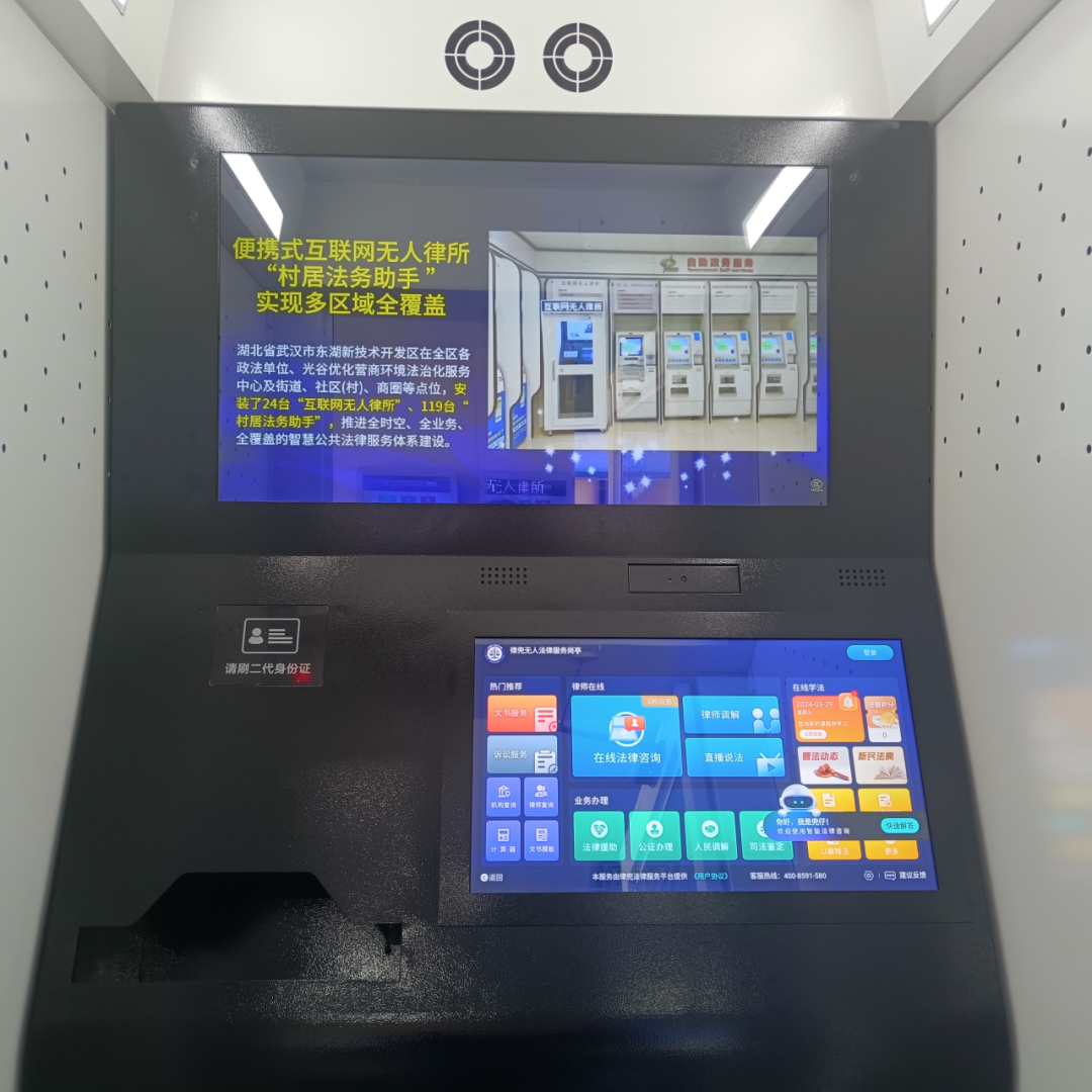 “互联网无人律所”是汇聚互联网、大数据、云计算等技术,内置高清触摸终端机、身份证读卡器、文件上传设备、打印设备等综合配套设备,搭建起的一个整合律师资源的互联网法律服务平台。涵盖快速咨询、材料共享、文书服务、视频咨询等功能。