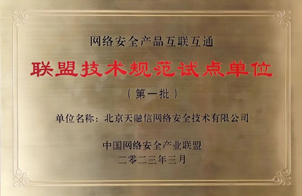 同时,天融信积极参与主管部门组织的网络安全产品互联互通相关工作,深度参与了网安标委归口的《信息安全技术网络安全产品互联互通 第1部分:框架》《信息安全技术 网络安全产品互联互通 告警信息格式》《信息安全技术 网络安全产品互联互通 资产信息格式》等国家标准及相关网络安全实践指南的研制工作,并于2023年3月在中国网络安全产业联盟(CCIA)基于以上标准开展的试点工作中荣获了网络安全产品互联互通技术规范试点单位(第一批)奖牌。