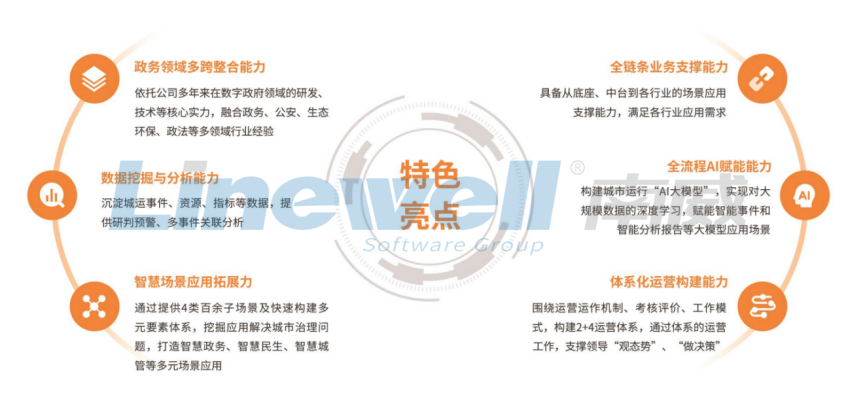 以多领域跨界整合及全链条支撑力为基础,通过AI大模型与数据要素重塑治理流程,智能分析数据,拓展智慧场景,构建体系化运营,提升政务效能。