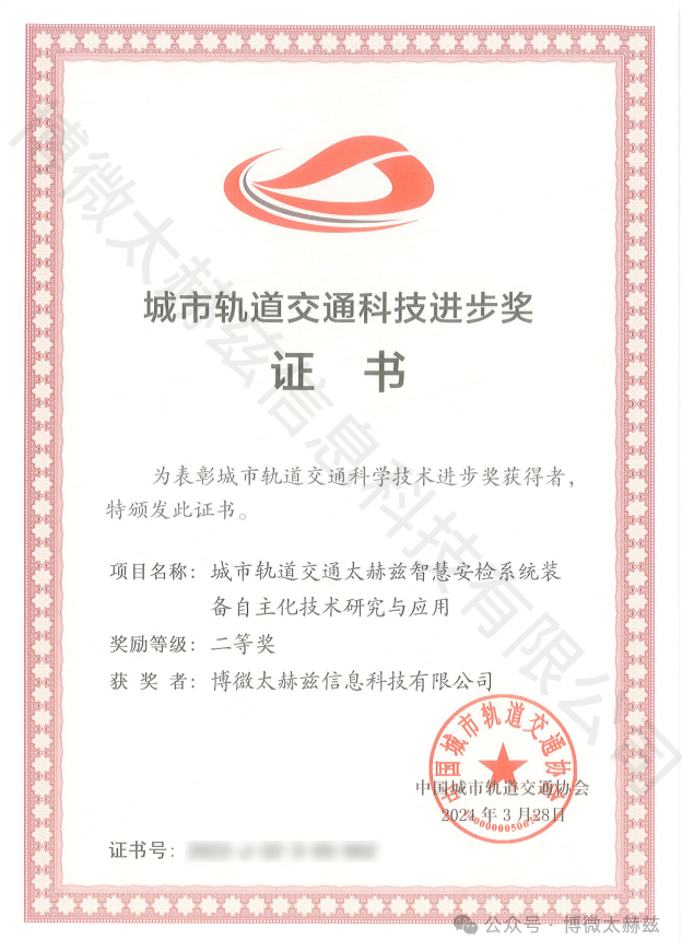 近日,博微太赫兹公司参与研发的课题项目“城市轨道交通太赫兹智慧安检系统装备自主化技术研究与应用”荣获城市轨道交通科技进步奖二等奖。