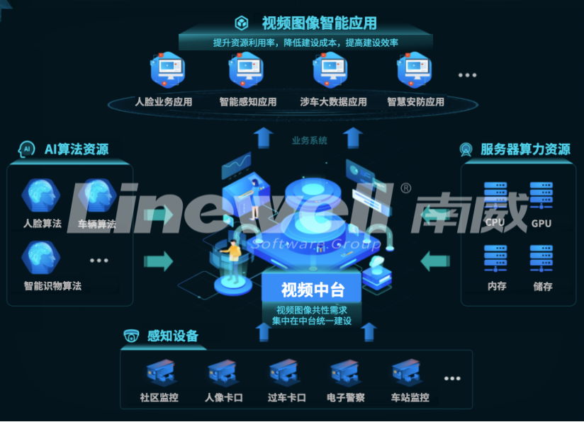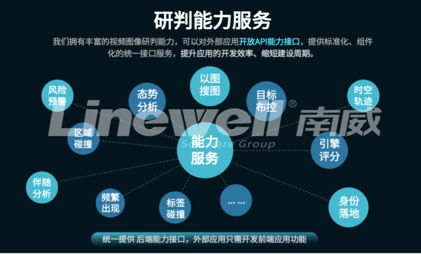 南威视频智能解析平台提供并开放丰富的视频图像解析、研判能力,以此赋能视频图像业务发展。其包括人脸、人体、机动车、非机动车数十种属性解析;以图搜图、融合图搜、布控预警、聚档检索、身份落地、全析档案、频繁出现、图像质量诊断等智能研判分析能力。通过建设并提供统一研判能力,支撑并构建实际的应用场景,形成视觉AI能力的场景化应用。