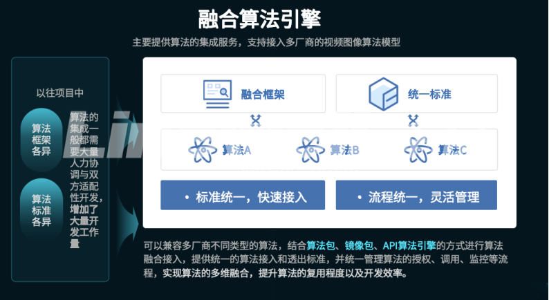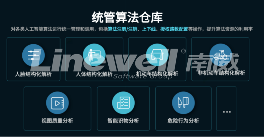 南威视频智能解析平台建立算法接入的统一接入与透出标准,支持算法引擎、算法镜像两种方式的融合入仓,与多种算法模型统一解析,打造集人脸、人体、机动车、非机动车识别,以及城市治理、危险预警等的融合性算法仓库。同时支持各类厂商的算法镜像管理、快速迭代、授权管理、解析数据存储等,并对算法资源及运行状态进行监控,重要预警第一时间上报。通过多源融合算法框架整合了国内主流的算法、训练和调度框架,以此建设了算法建模运行底座,并允许各类型算法统一接口调用,提高系统的灵活性和扩展性,可极大程度去满足行业的多样性需求。