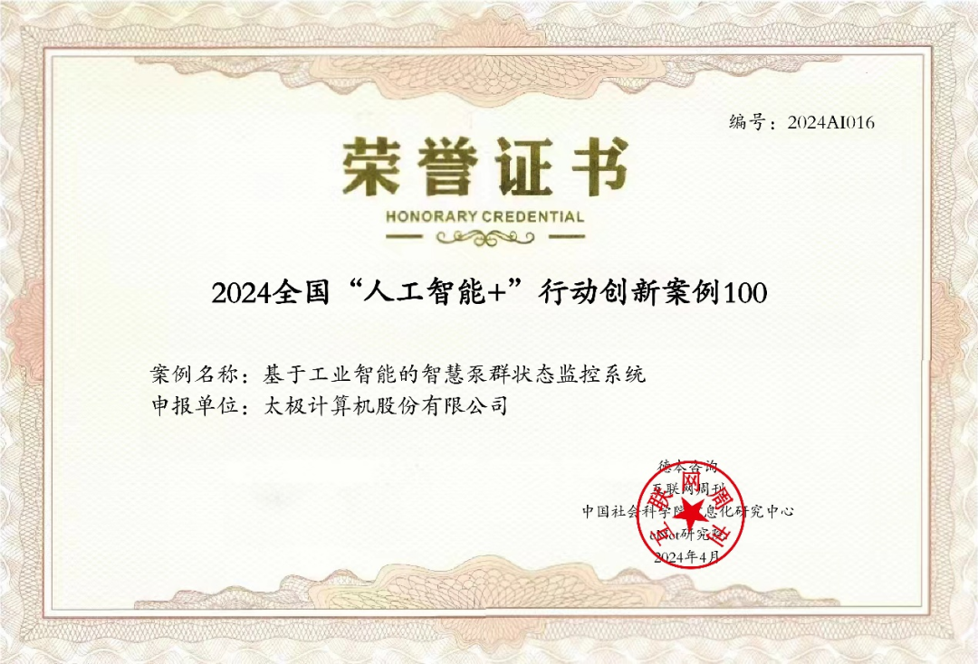 近日,《互联网周刊》联合eNET研究院、德本咨询发布“2024全国'人工智能+'行动创新案例100”,太极股份“基于工业智能的智慧泵群状态监控系统”案例成功入选。