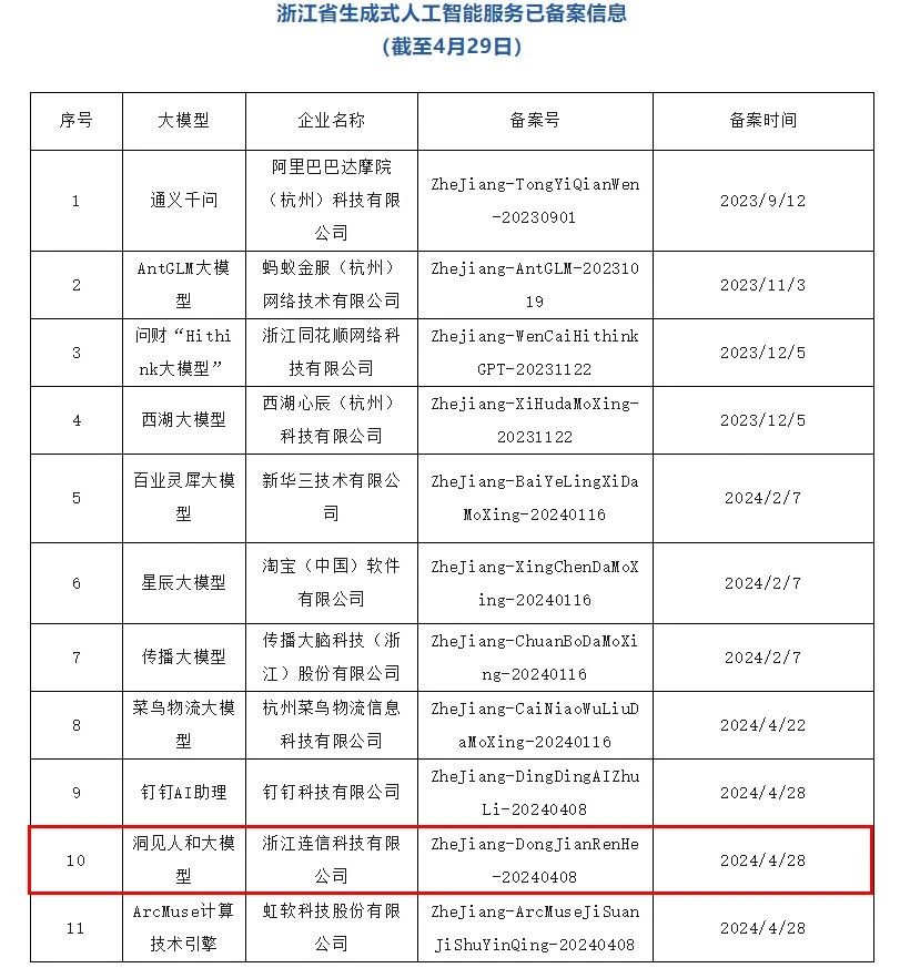 2024年4月29日,浙江省委网信办正式公布浙江省已备案大模型清单,连信“洞见人和大模型”成功通过国家互联网信息办公室《生成式人工智能服务管理暂行办法》备案许可,标志着连信在人工智能大模型技术及应用方面获得了国家级认可,为洞见人和大模型各领域智能体在全国大规模应用奠定了坚实基础。洞见人和大模型是全国首个通过国家网信办备案的心理应用大模型,也是浙江省第十个“人工智能大模型”!