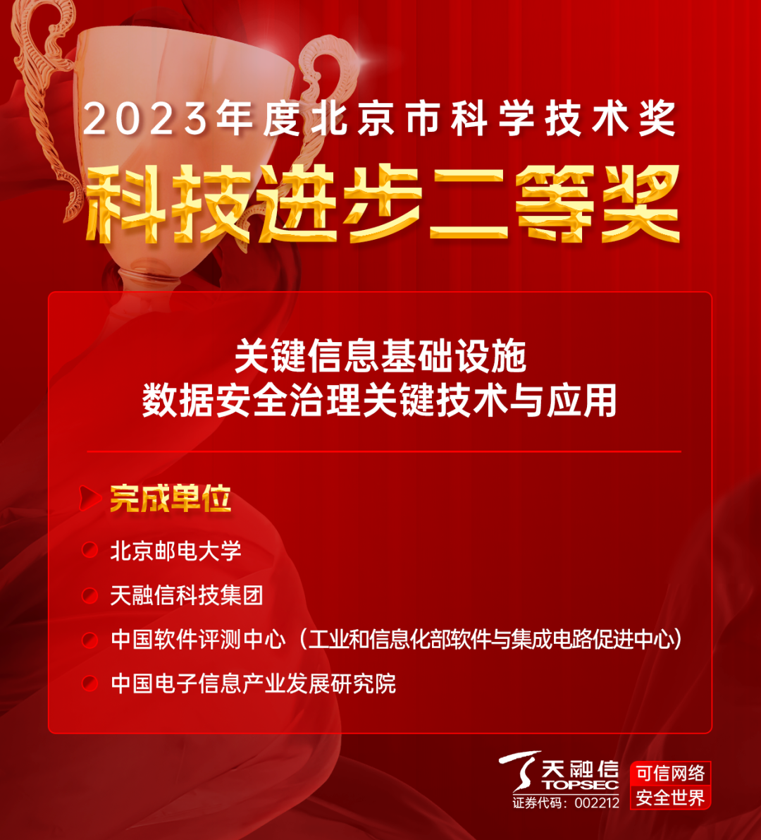 近日,北京市人民政府公布2023年度北京市科学技术奖励决定。天融信科技集团、北京邮电大学、中国软件评测中心(工业和信息化部软件与集成电路促进中心)、中国电子信息产业发展研究院联合申报的《关键信息基础设施数据安全治理关键技术与应用》项目荣获北京市科学技术进步二等奖。天融信科技集团董事长兼CEO李雪莹博士,副总裁唐宁、王奇飞共同参与了此项目,在重大关键技术把关、突破以及项目应用与推广方面做出重要成果。
