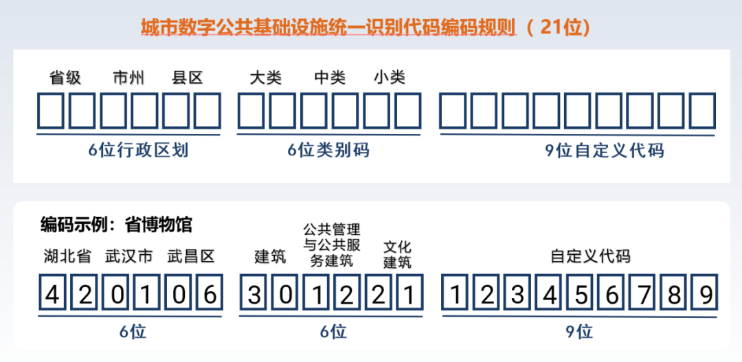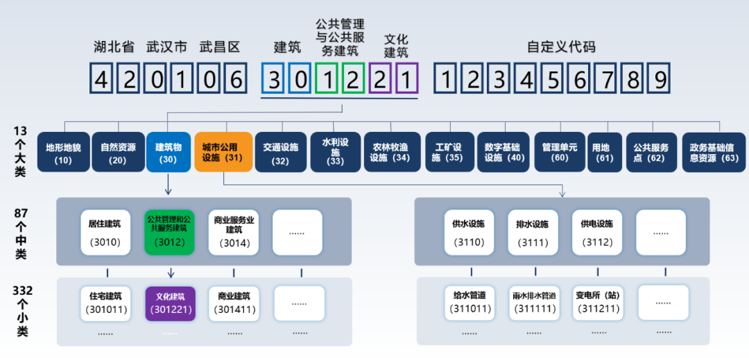 《城市数字公共基础设施统一识别代码编码规则》确定了3段21位的城市实体对象统一识别代码编码规则和分类框架,将城市实体对象划分为13个大类、87个中类和332个小类。