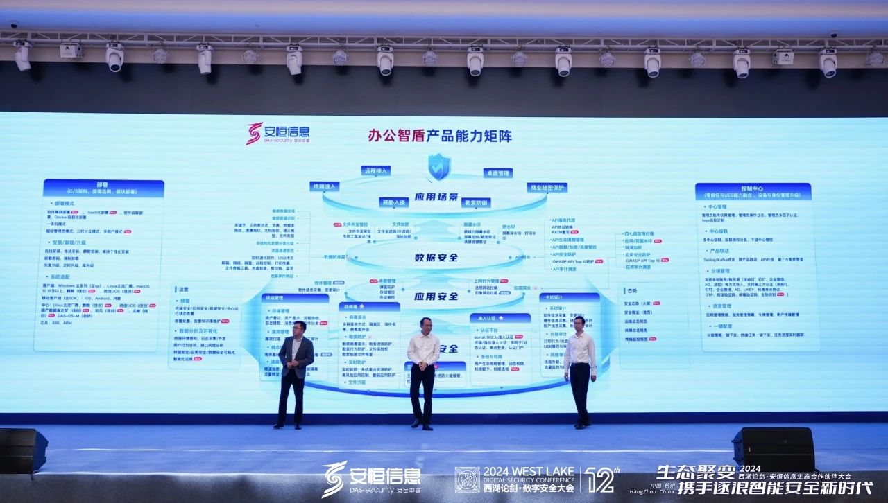 安恒信息高级副总裁杨勃、安恒信息生态合作部总经理吴伟京、安恒信息副总裁杨绍波共同见证办公智盾的发布。