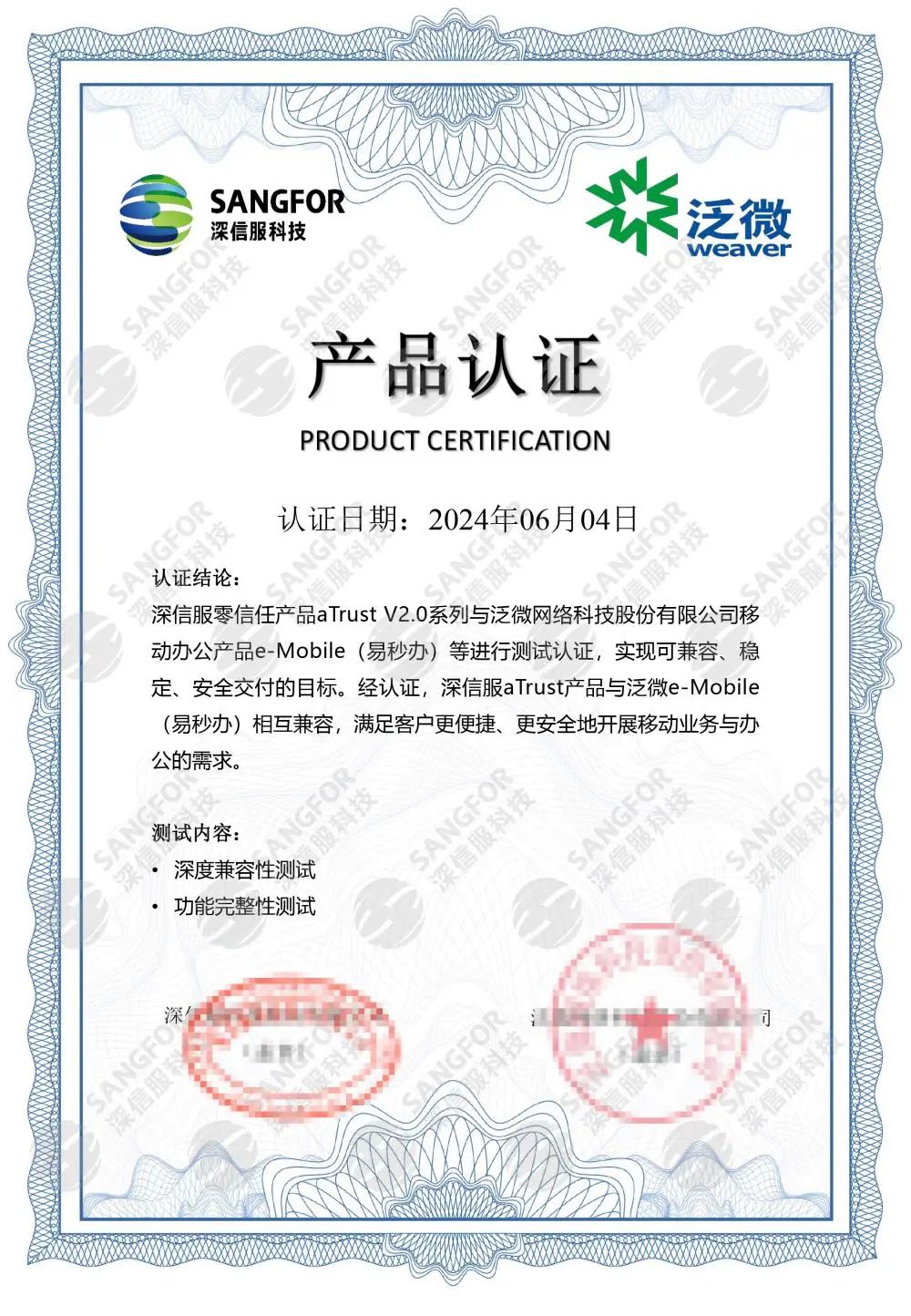 双方兼容认证证书