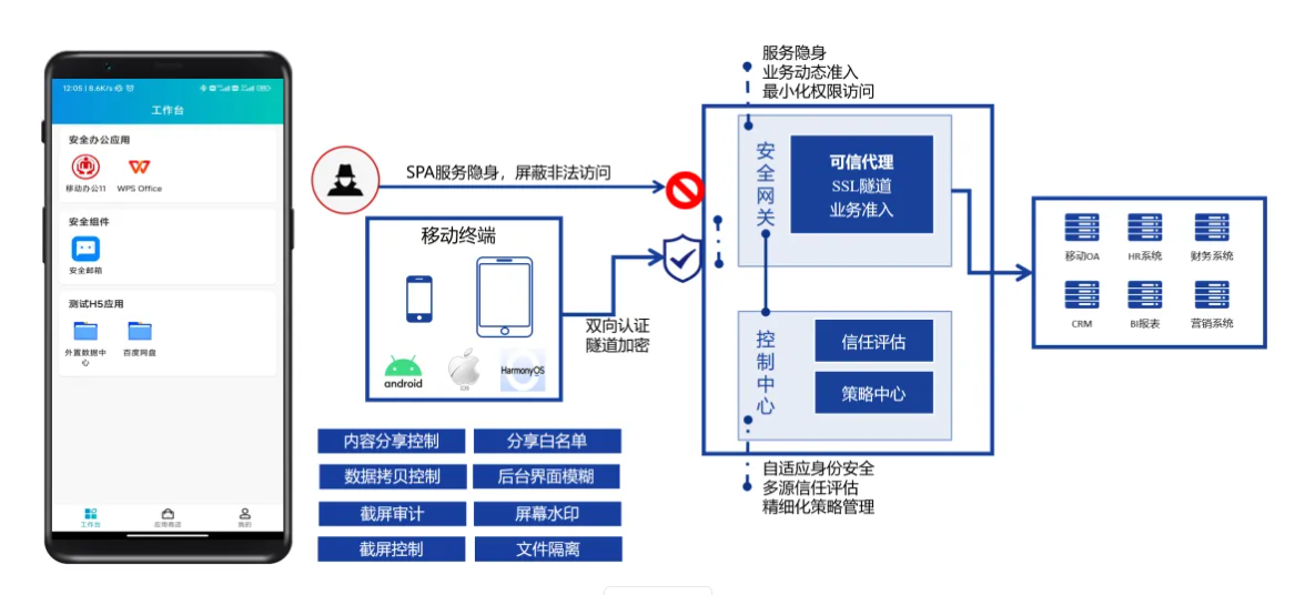 凭借在网络安全领域的深厚积累,深信服基于零信任安全架构,为泛微e-Mobile提供了强大的安全能力: