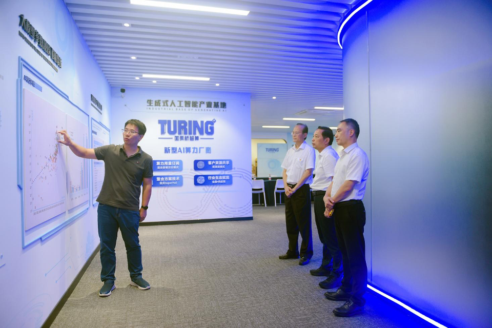 在图灵新智算生成式人工智能产业基地,调研组与技术团队进行了亲切交流,详细询问了公司在算力布局、模型训练、应用落地等方面的进展。调研组领导表示,人工智能是新一轮科技革命和产业变革的重要驱动力量,高新兴要抓好投资图灵新智算这一重要机遇,积极探索人工智能技术在各行各业的深度融合,为社会发展贡献更多智慧力量。