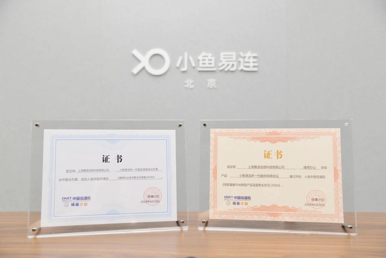 小鱼易连凭借新一代融合视频会议的技术领先性和应用创新性,成功入围数字化转型全景图、技术解决方案集,获双项荣誉证书,充分彰显小鱼易连在推动数字化转型方面的卓越实力和领先地位,为行业树立新标杆、开启新引领。