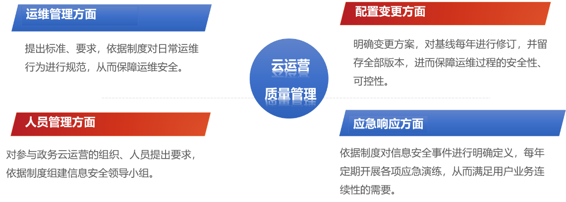 在云运营质量管理体系方面,太极股份将质量管理体系和政务云服务项目的运营特点、安全要求及最佳实践进行结合,提标准、定流程,对政务云运营进行质量控制,在日常运维工作中运用专业的知识、技能、工具和方法,使运维工作能够在有限资源条件下,达到高规格的政务云运营要求。