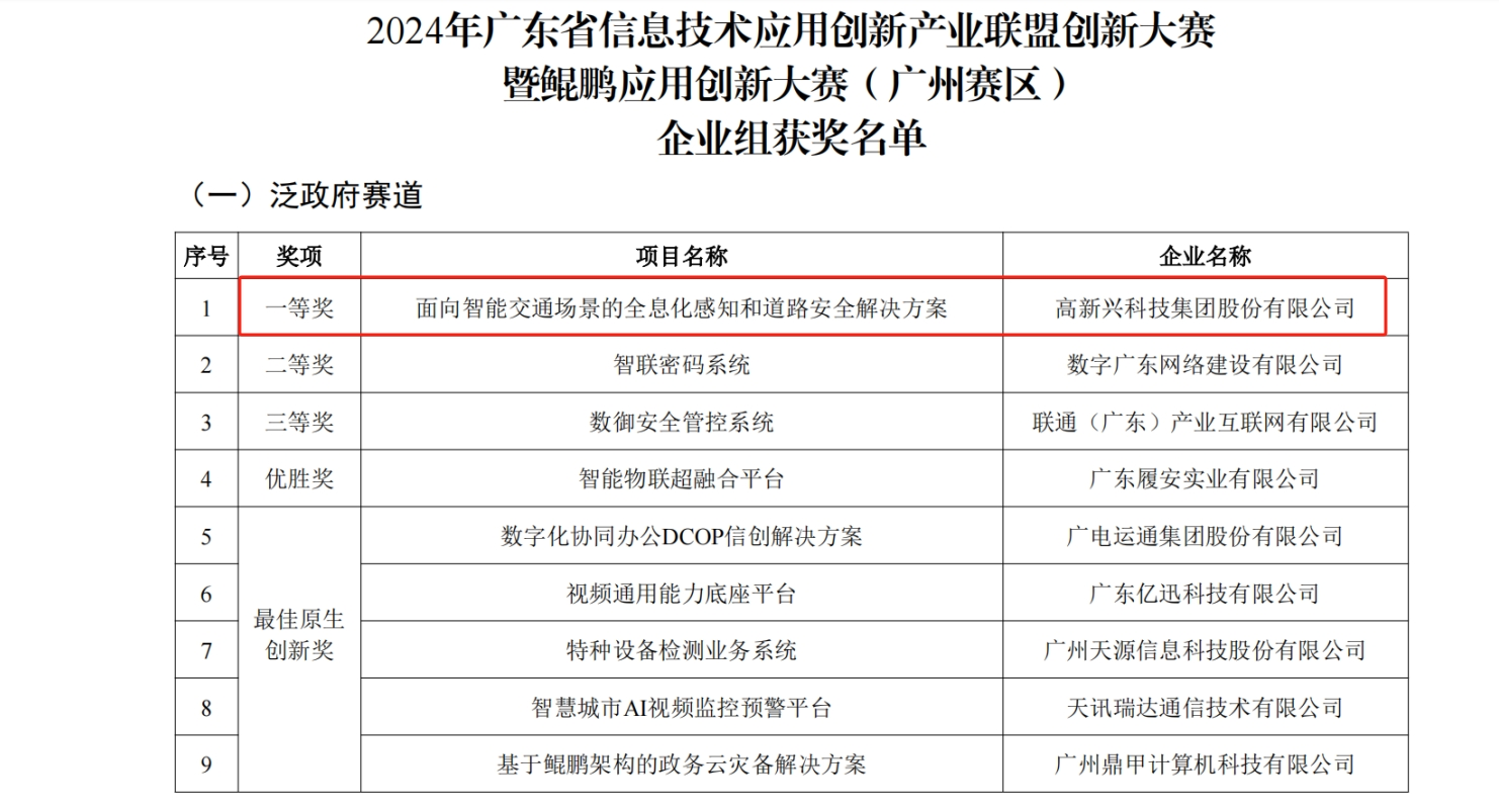 近日,高新兴科技集团在2024年广东省信息技术应用创新产业联盟创新大赛暨鲲鹏应用创新大赛(广州赛区)中成功卫冕,参赛作品《面向智能交通场景的全息化感知和道路安全解决方案》荣获泛政府赛道一等奖,这也是高新兴连续第二年荣获此项殊荣。该方案基于城市级视频联网平台,以全场景AI核心技术驱动全息化感知和道路安全应用拓展,为车路协同和智能交通提供全栈智能解决方案。