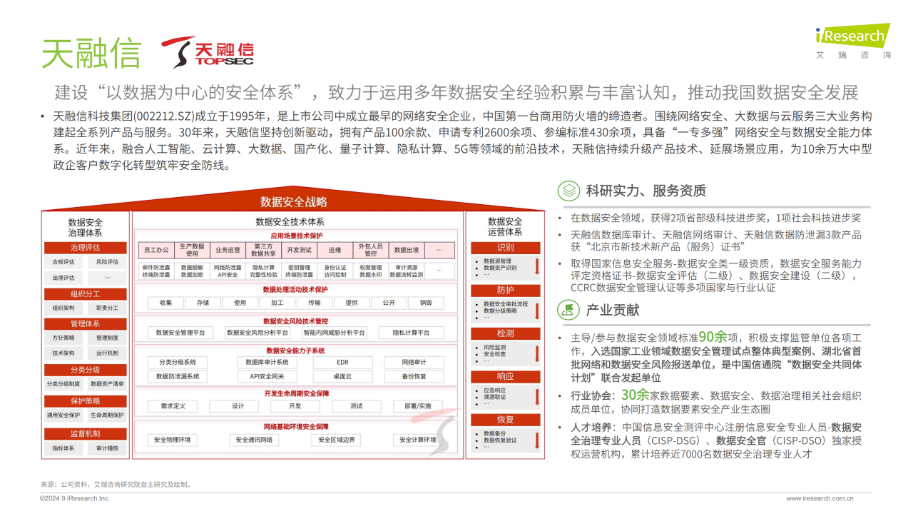 近期, 国务院总理李强签署第790号国务院令,公布《网络数据安全管理条例》,自2025年1月1日起施行。10月9日,中共中央办公厅、国务院办公厅印发《关于加快公共数据资源开发利用的意见》,部署加快推进公共数据资源开发利用工作。网络数据安全管理工作须坚持总体国家安全观,统筹发展和安全,既加强网络数据安全保护,又鼓励和促进网络数据依法合理有效利用。近日,《2024年中国数据要素流通行业研究报告》(以下简称“报告”)正式发布,天融信入围数据要素流通卓越者,入编“2024年中国数据要素流通服务市场产业图谱”,天融信数据安全防护体系建设、数据安全管理与风险分析双类别案例收录报告。