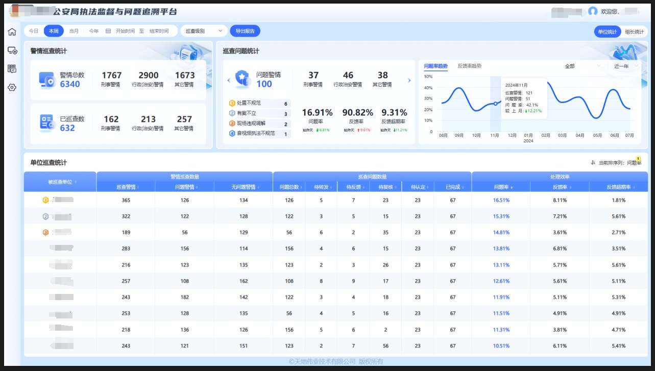 天地伟业协助公安机关强化警情、案件两个全量监督管理,打通不同警种、不同场景、不同层级间的数据壁垒,实现横向全要素、纵线全流程的执法监督,推动执法规范化水平。