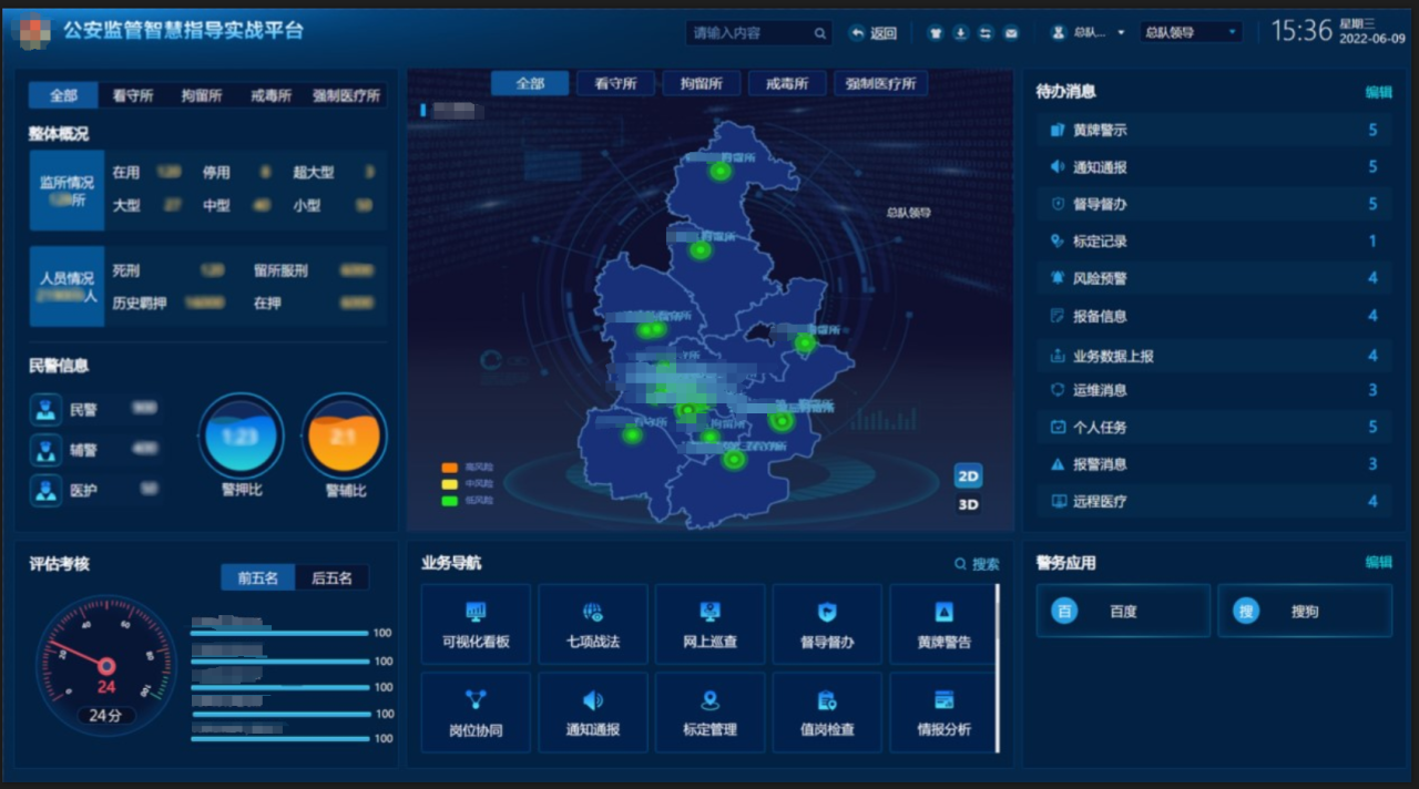 充分结合信创、微服务等技术,可对重点时段、部位、人员、环节和事件的巡查。融合监所大数据,智能联动重点事件。融合视频监控系统、督导检查系统、监所基础信息系统、违法犯罪人员信息系统,对接视频资源、监所基础信息、在押人员数据等信息,将公安监所的警押比与关押比、羁押人员类别与风险等级、设备联网率与在线率等常用数据全部融于一体。实现了公安监管业务指导部门对辖属公安监所动态分析、预判风险,使得警务工作更具有目标性、实效性。以此协助监管总队构建具有天津特色的现代警务体系。