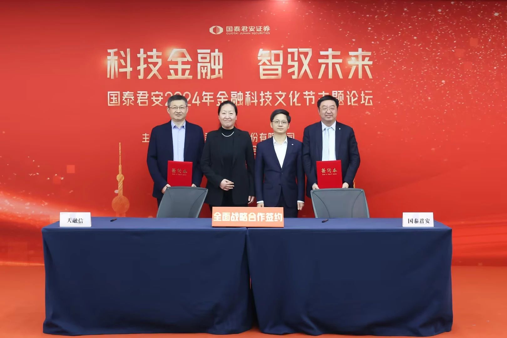 10月24日,以“科技金融 智驭未来”为主题的国泰君安2024年金融科技文化节主题论坛在上海成功举行。会上,天融信与国泰君安达成全面战略合作,天融信科技集团董事长兼CEO李雪莹,天融信科技集团高级副总裁江建平,国泰君安党委副书记、总裁李俊杰,国泰君安首席信息官、数据管理与应用部总经理俞枫出席签约仪式。同时,天融信科技集团受邀出席圆桌论坛,为科技金融健康发展建言献策。