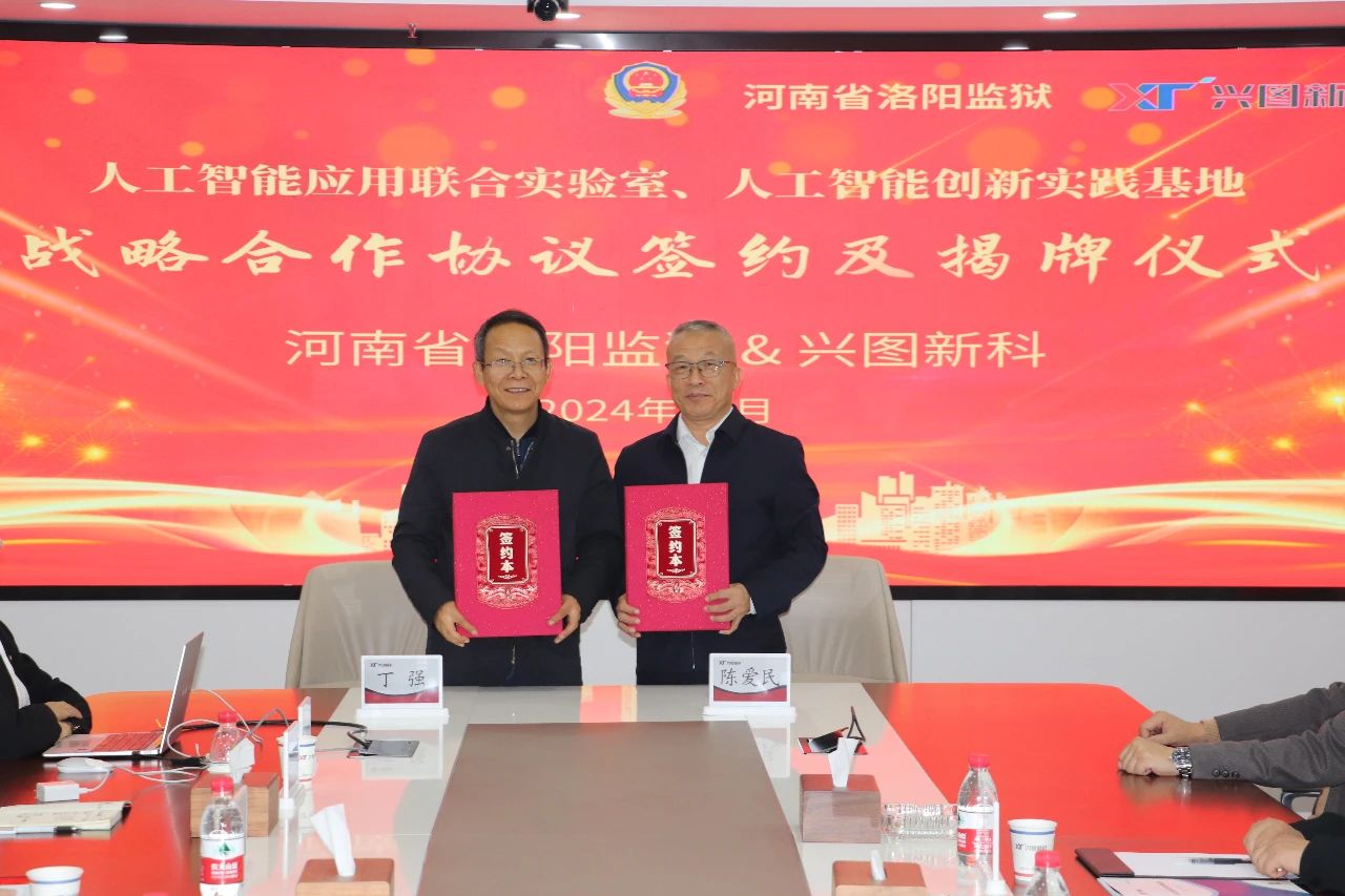 10月21日,兴图新科与河南省洛阳监狱共同成立人工智能应用联合实验室及人工智能创新实践基地,正式签署了战略合作协议并举行揭牌仪式。本次签约揭牌仪式由河南省洛阳监狱副监狱长亲自参与,兴图新科则由高级副总裁陈爱民为代表出席,彰显了双方对此次合作的高度重视。