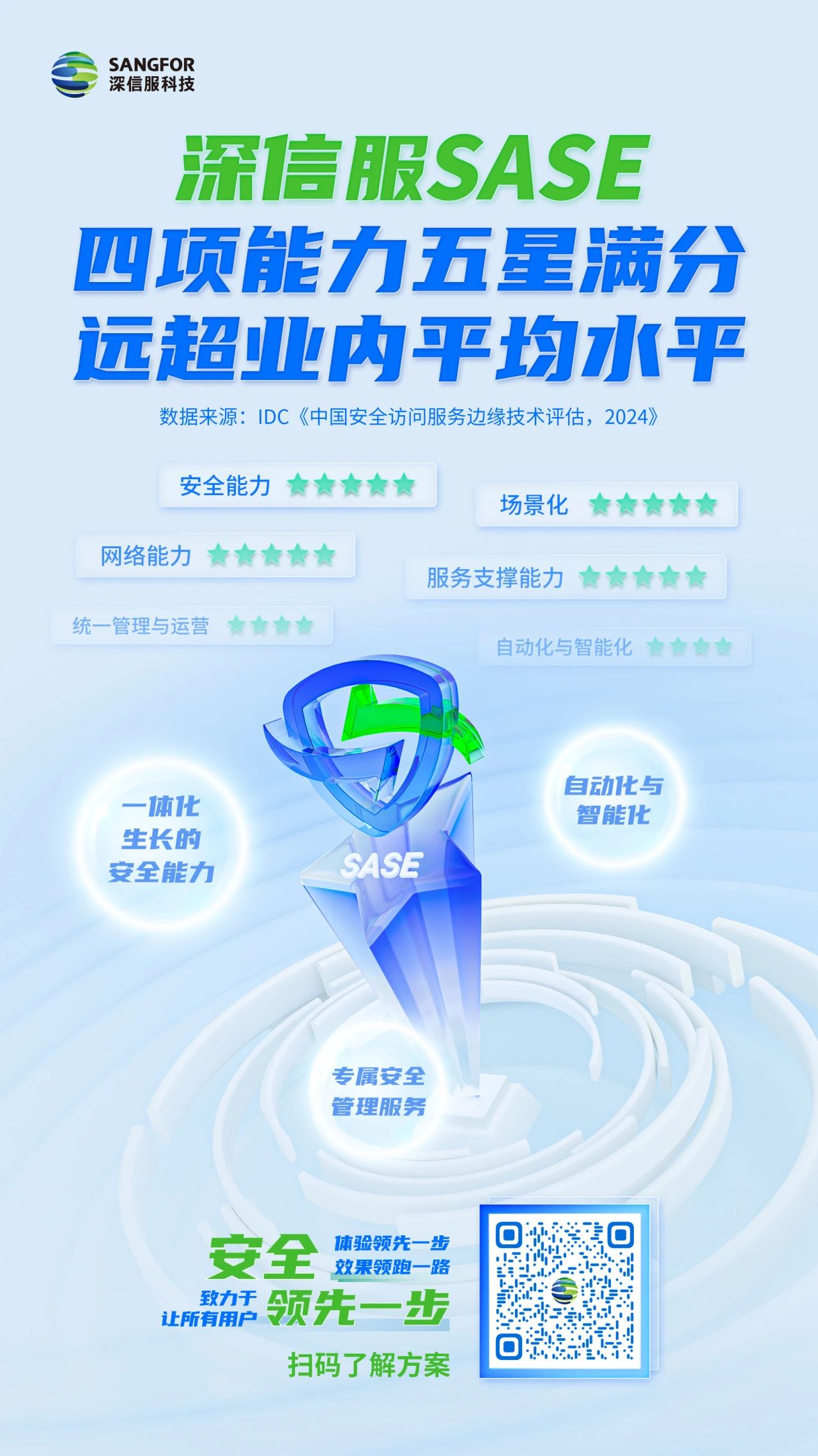 近日,IDC发布《中国安全访问服务边缘技术评估,2024》报告(以下简称“IDC报告”),深信服云安全访问服务SASE在安全能力、网络能力、场景化解决方案能力及服务支撑能力四项评估中获得满分五星评价。